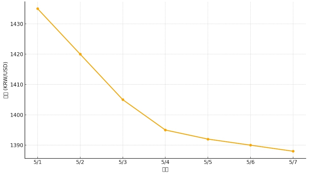 2025년 5월 7일, 원/달러 환율이 장중 1,388원까지 하락하며 올해 최저치를 기록했습니다.